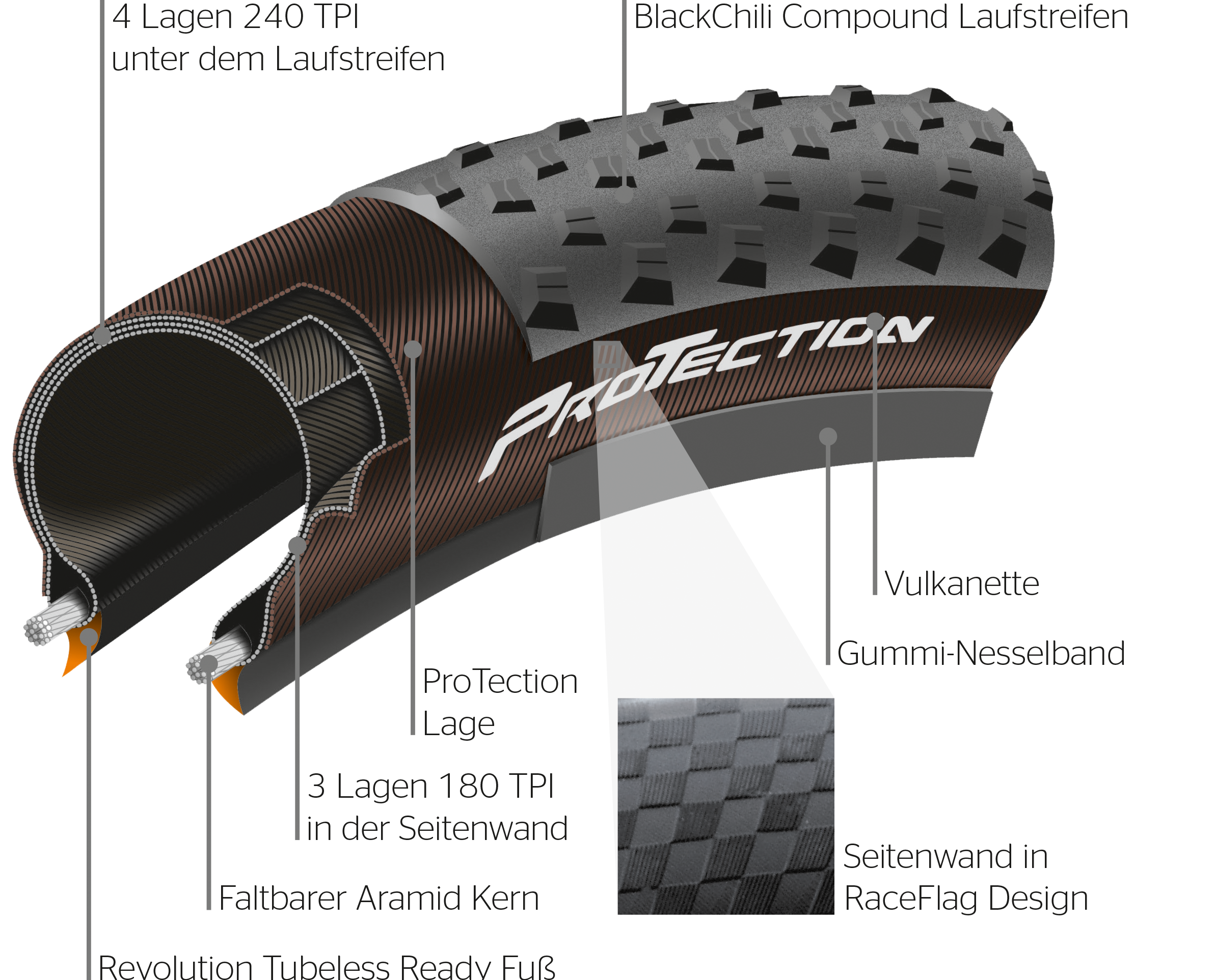 Die speziell entwickelte, zusätzliche und rundum laufende Pannenschutzlage unsere Karkassen besonders widerstandsfähig und unempfindlich gegen Beschädigungen und das Eindringen von Fremdkörpern. Für maximalen Effekt kombinieren wir ProTection mit BlackChili Compound. Das Resultat: Ihre Reifen sind vielseitig einsetzbar, weisen ein geringes Gewicht auf und haben ein attraktives Design. Darüber hinaus können Reifen mit dieser Technologie auch Tubeless Ready eingesetzt werden.