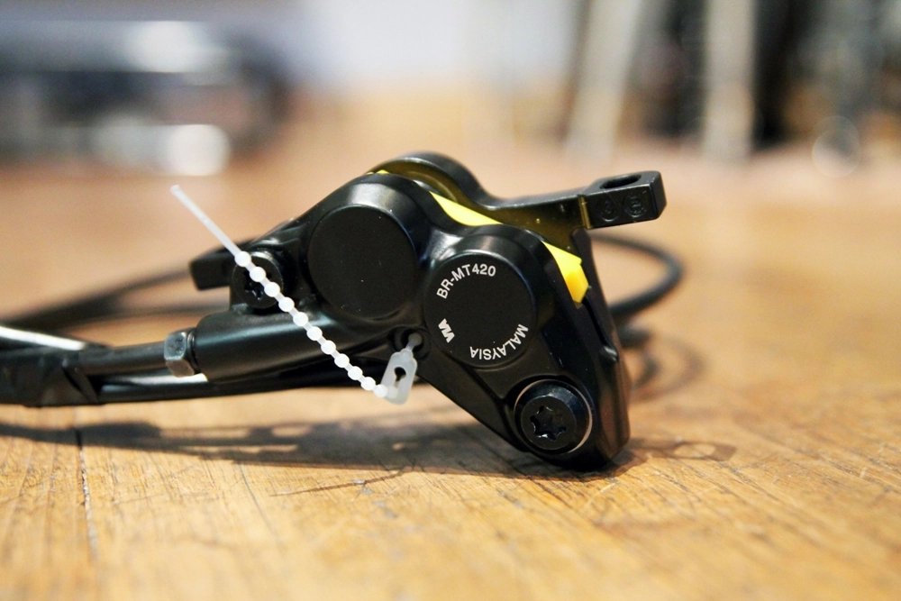 Die hydraulische BR-MT420 Scheibenbremse von Shimano mit ergonomischen SLX Bremshebel BL-7100 2-Finger-Bremshebel und BR-MT420 4-Kolben Bremssattel stellt den Maßstab für kostengünstige Performance-Bremssysteme dar. Grund genug euch ein fertiges Brems-Set für Euer Bullitt mit extralanger Leitung für vorne anzubieten.