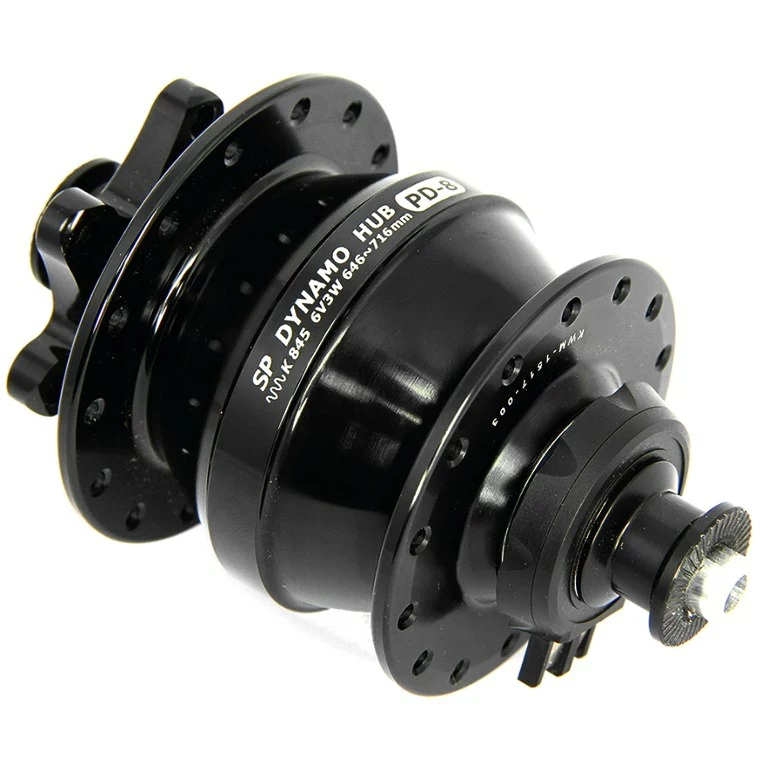 Die P-Serie Dynamos sind nicht nur leistungsstark, sondern auch effizient, sie bieten einen unerreichten Wirkungsgrad von 78 % bei 15 km/h. Obwohl die Scheibenbrems-Variante höheren Belastungen ausgesetzt ist und daher ein im Inneren verstärktes Nabengehäuse besitzt, konnte das Erscheinungsbild filigran und das Gewicht niedrig gehalten werden. Der leistungsstarke Magnetkern sorgt für hohe Leistung und auch bei dieser Variante sind verschiedene Farben und Lochzahlen erhältlich. Der Shutter Precision PD-8 Nabendynamo gehört mit 410 Gramm zu den Leichtesten seiner Klasse. Er bietet einen sehr guten Wirkungsgrad von 78% bei 15 km/h und niedrige Leerlaufverluste. Die Nennleistung beträgt 3 Watt bei einer Spannung von 6 Volt. Er ist geeignet für Laufradgrößen von 26-29 Zoll, mit 6-Loch Scheibenbremsaufnahme und für Schnellspannachsen.
